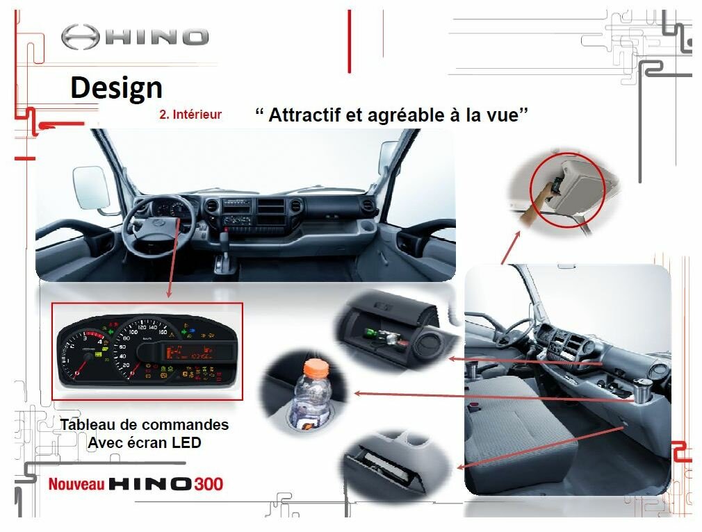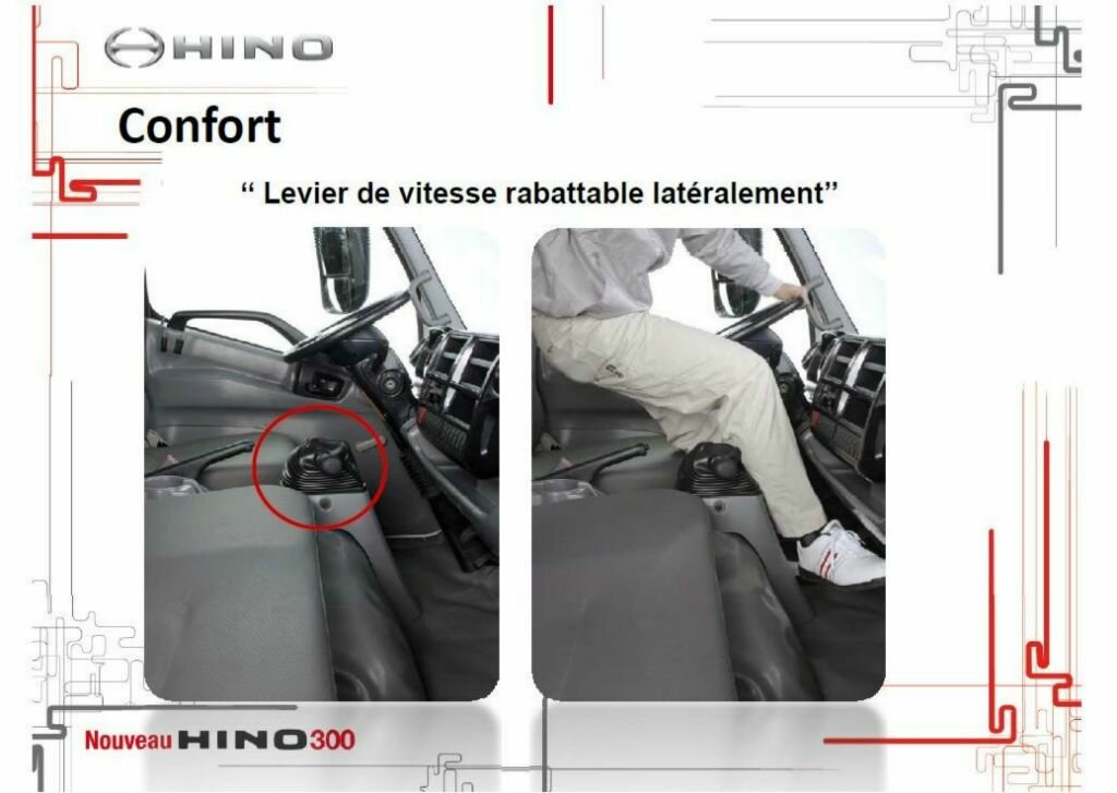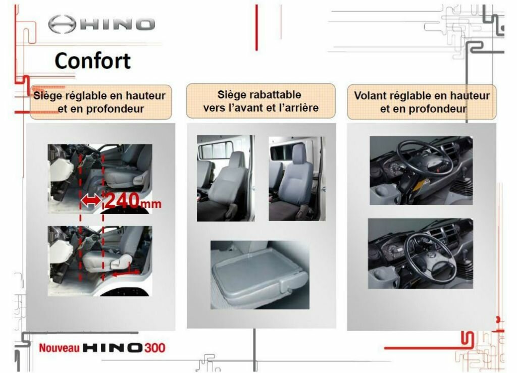 A l’intérieur, le nouveau Hino 300 marie design moderne et confort, permettant au conducteur de trouver son compte dans un aménagement pensé de sorte à lui faciliter la tâche. Ce dernier dispose, à titre d’exemple, d’un siège réglable en hauteur et en profondeur, rabattable vers l’avant et l’arrière, ainsi qu’un volant réglable en hauteur et en profondeur.
