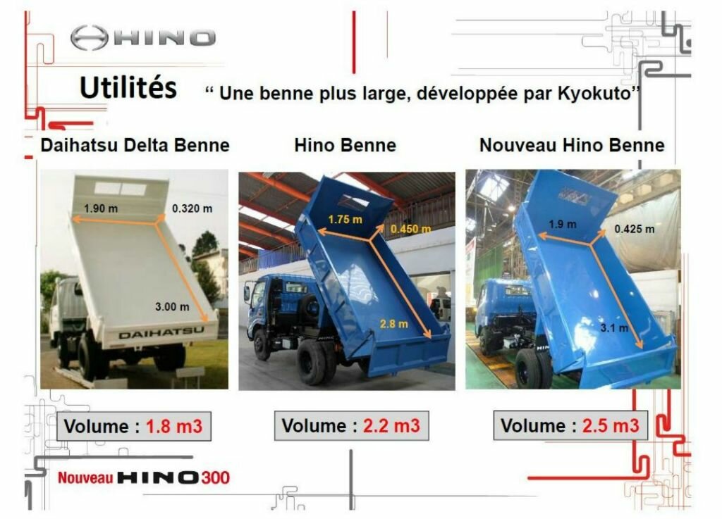Avec le nouveau Hino 300, le représentant de la marque japonaise peut composer avec des arguments encore plus convaincants, à commencer par le design qui permet, entre autres, à la cabine de gagner 30 cm en largeur et offre une charge utile de 2.5 m3 contre 2.2 m3 sur l’a l’ancienne version et 1.8 m3 sur le Daihatsu Delta.