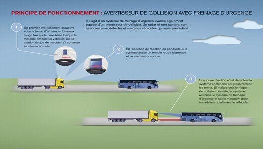 Dans cette logique, le constructeur suédois pousse la technologie vers la haute altitude et équipe ses camions de systèmes en conséquence, expliquera le directeur de la sécurité chez le constructeur suédois. Ainsi, en plus de la ceinture de sécurité (dont il est l’inventeur depuis 1959), Volvo équipe tous ses camions en série d’avertisseurs d’oubli de port de ceinture. Sur le plan de la fatigue et de la distraction, Volvo a mis en place nombreux systèmes. Citons, entre autres, le régulateur d’allure et d’espacement ACC( régulateur de vitesse maintenant automatiquement une distance de sécurité adéquate avec le véhicule qui précède), le dispositif d’alerte conducteur DAS ( si le véhicule dévie de sa trajectoire, le conducteur en est averti via un signal sonore et un message…), ou encore le système d’assistance au maintien de la trajectoire LKS qui avertit le conducteur si le véhicule franchit des marquages au sol alors qu’aucun clignotant n’est enclenché.