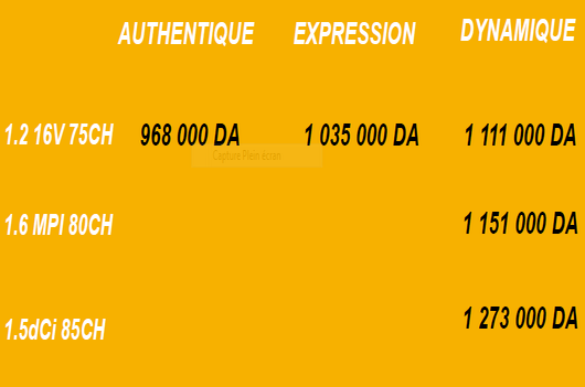 Sous le capot, la star des voitures en Algérie est proposée avec trois blocs au choix : l’éprouvé et reconnu 1.2 essence 16 v de 75 ch, le 1.6 MPI de 80 ch, offrant un excellent compromis entre l’agrément de conduite, et le 1.5 dCi 85 disposant d’un couple adapté : 200 Nm à 1 750 tr / mn, qui lui permet de se montrer vif dès les plus bas régimes.