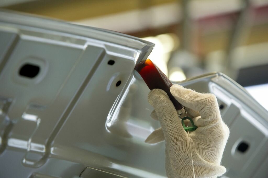 La lumière, son intensité et ses angles d’orientation sont normalisés pour favoriser l’évaluation des experts. Chaque teinte produite en série est testée au moins une fois par semaine. Une fois la carrosserie peinte, des opérateurs vérifient l’absence de grains, de coulures etc… en suivant un parcours de détection défini où « l’œil suit la main ». Pour améliorer la détection d’éventuels défauts, les éclairages ont été remplacés par des néons spécifiques 3 positions.