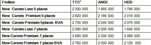 Le nouveau Carens est disponible chez Kia Motors Algérie en deux finitions: Luxe et Premium - avec cinq ou sept places- en motorisation unique 1.7 CRDI de 136 ch. Dès la finition Luxe, le nouveau Carens offre une belle liste d’équipements (régulateur et limiteur de vitesse, vitres électriques avant/arrières automatiques, détecteur de pluie, feux d’angles, système de réglage de modes de conduite (normal/confort/sport), commande Bluetooth au volant, direction assistée électrique, climatisation automatique bi-zone, commande audio au volant, Ordinateur de bord, verrouillage centralisé à distance avec clé pliable et alarme d’origine, console d’origine intégrée Radio CD/MP3 avec connexion USB, Auxiliaire, 4haut parleurs et 2tweeters. Vitres arrière sur-teintées,…)