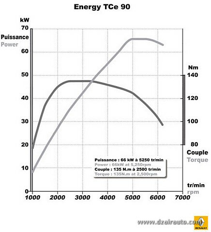 Notre 3 cylindres offre un couple maximal de 135 Nm à 5250 tr/mn, son turbo à faible inertie permet une disponibilité de 90% du couple dés 1650 tr/mn et se comportant ainsi comme un moteur diesel, comme nous avons eu à le constater. Les reprises en montée de côte sont respectables.