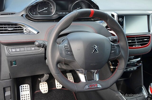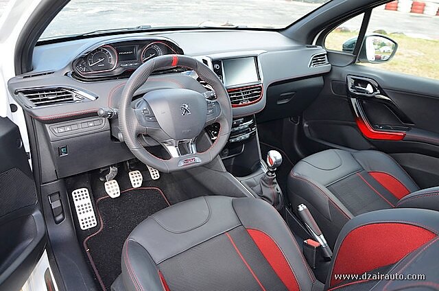L’intérieur de a 208 GTI est également une invitation à la sportivité à travers nombreux élément spécifiques, l’exemple de la planche de bord à surpiqûres rouges, du volant cuir avec inser chromé au sigle « GTI », des sièges sport siglés « GTI », du pommeau de levier de vitesses aluminium « chrome satin » avec insert latéral rouge et le combiné spécifique (signature lumineuse spécifique, joncs de cadrans chromés rétro éclairés rouges par LED, fond de compteurs en aluminium brossé avec motifs à damiers et aiguilles blanches).
