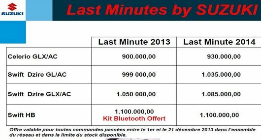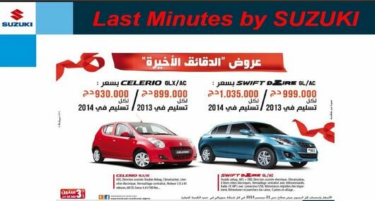 Sous le slogan Last Minute, bien assumé d’ailleurs, toute la gamme Suzuki gagne en remises. A commencer par la Swift DZire dont la finition GL/AC voit son prix descendre au dessus de 1 million de DA, pour être cédée à 999 000 DA. Ce prix est accordé sur les livraisons 2013, alors que pour livraison 2014, le même véhicule est affiché à 1 035 000 DA, soit avec une remise toujours conséquente.