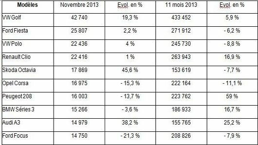 La Volkswagen Golf continue à dominer les ventes du marché européen sans risque de se faire rattraper. Pour preuve, la compacte allemande a réussi à creuser encore davantage l’écart sur ses poursuivantes en novembre dernier après avoir totalisé 42 740 et une croissance de 19,3% par rapport à la même période 2012 , alors qu'entre janvier et novembre 2013, elle cumule 433 452 unités (+5,9%).