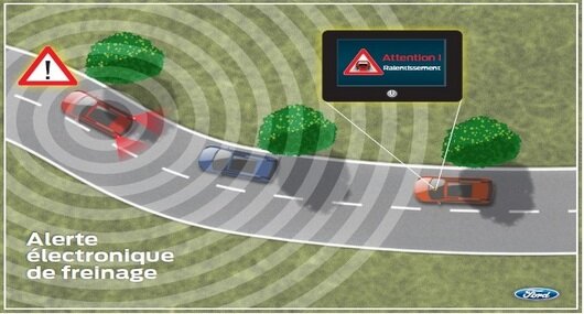 Parmi de nombreuses fonctions de communication entre véhicules et infrastructures, Ford a dirigé le développement du feu stop électronique et de l’alerte d’obstacle, qui s’appuient sur un réseau WIFI dédié aux systèmes de transport intelligents.