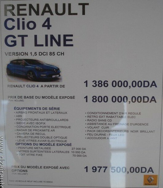 La Clio GT Line est basée sur la finition Exception de la sous compacte au losange. Elle est proposée en motorisations essence TCe 90, et diesel dCi 85. Ses tarifs débutent à 1 627 000 DA TTC pour l’essence et 1 680 000 DA TTC pour le diesel.