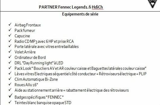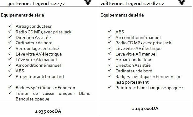 La 301 Fennec Legend est proposée avec le bloc 1.2 essence de 72ch, au prix de 1 035 000DA, alors que la 208 de la même série est affichée à 1 199 000 DA en version 1.2 essence de 82 ch. Quant au nouveau venu dans la série Fennec, en l’occurrence le Partner, il est équipé de la motorisation Legend1.6 Hdi de 90 ch au prix de 1 765 000 DA.