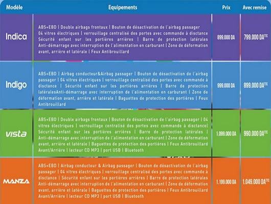 A la veille du salon de l’automobile d’Alger (18-28 mars) Tata Motors Algérie, représenté par le groupe Elsecom, annonce des remises sur l’ensemble de sa gamme pouvant atteindre jusqu’à 150 000 DA dans le cas de la Manza, alors que les modèles Vista, Indigo et Indica bénéficient chaque d’une remise de 100 000 DA.
