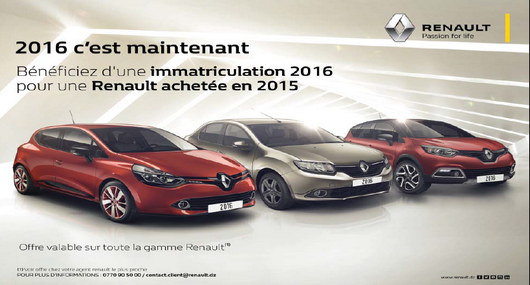 Les immatriculations 2016 ont commencé chez Renault Algérie. Les deux marques Renault et Dacia sont concernées par cette opération qui permet au client d’acheter son véhicule dès ce début de décembre et de bénéficier d’une immatriculation 2016.
