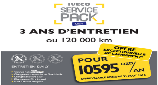 Poursuivant son offensive service après-vente, Ival lance 2 nouveaux packs entretien, en l’occurrence « AMANE et RAHA » aux prix respectifs de 10 595 DA et 12 835 DA. A partir du 13 juin courant et jusqu’au 31 août prochain, les clients pourront profiter de cette offre dédiée à l’entretien de l’Iveco Daily durant les trois prochaines années ou les 120 000 km.