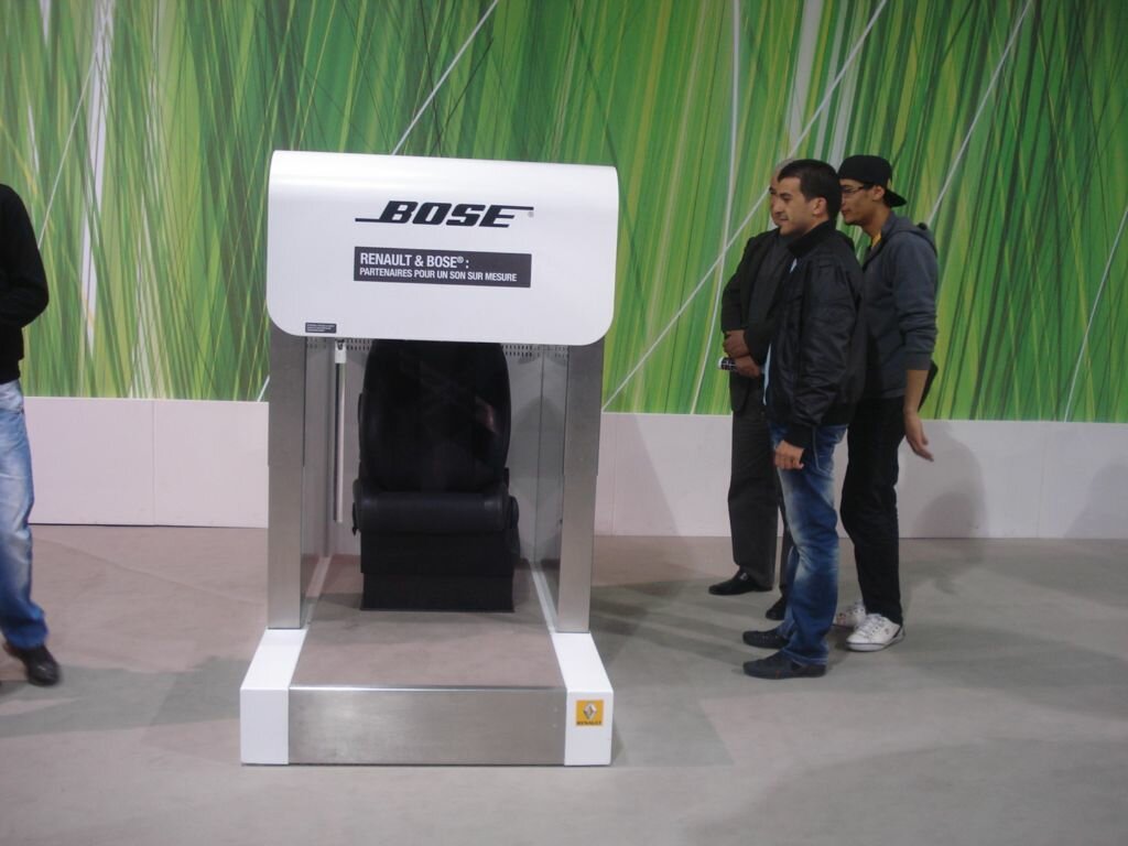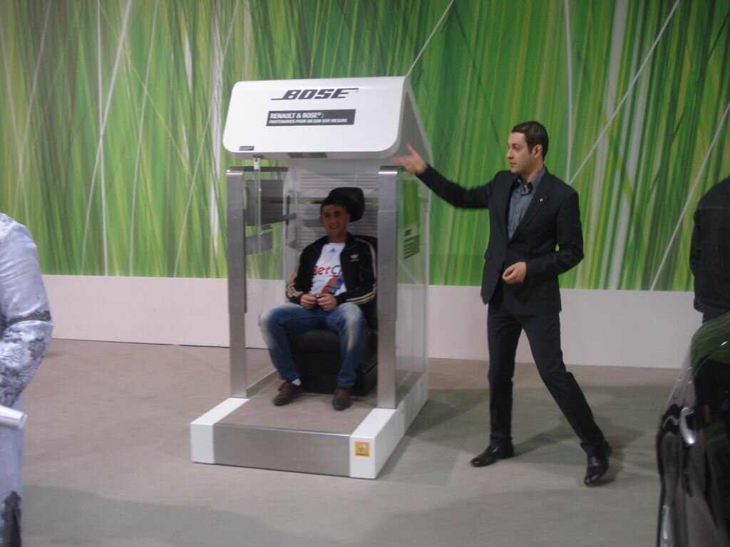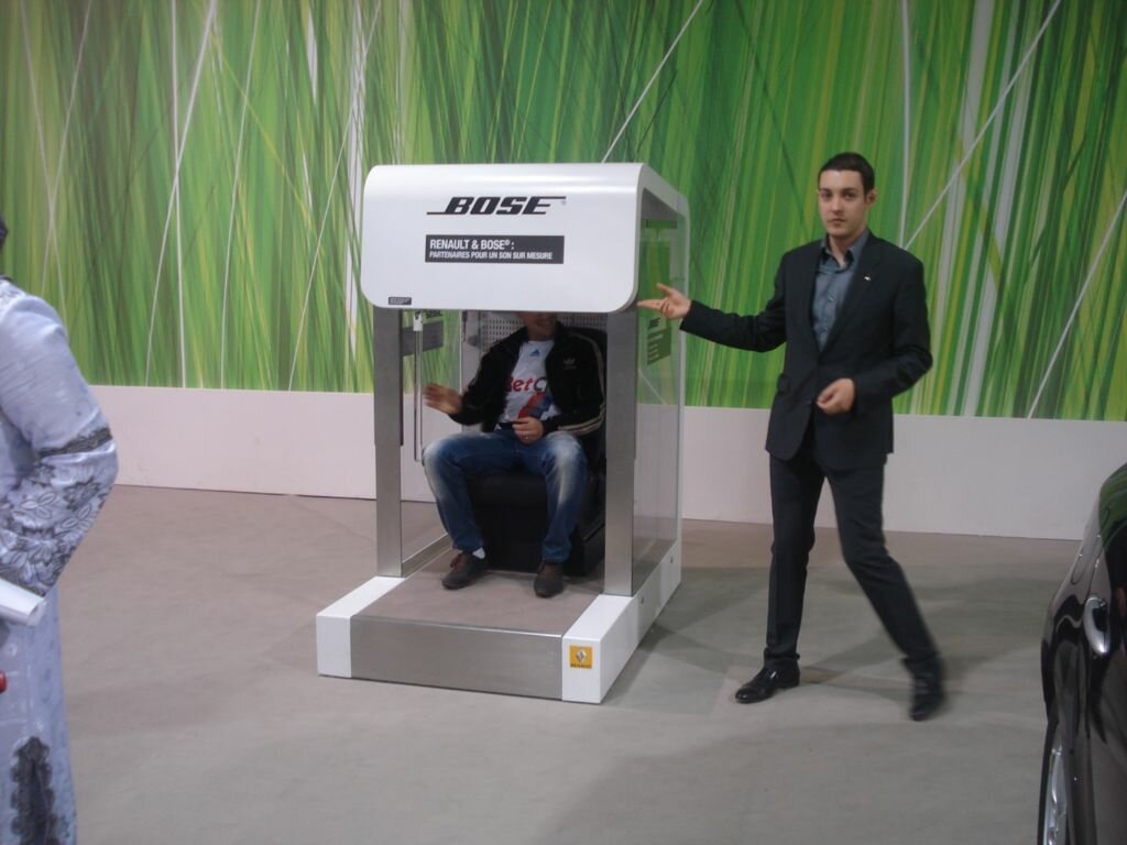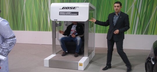 Tour à tour, les visiteurs du pavillon Renault s’installent dans les véhicules livrés en série Bose pour tester la qualité du son de la nouvelle sonorisation. Le test semble concluant.